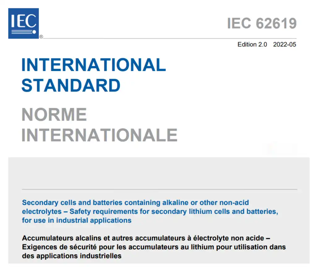 1. International Electrotechnical Commission. (2017). IEC 62619:2017 Secondary cells and batteries containing alkaline or other non-acid electrolytes - Safety requirements for secondary lithium cells and batteries, for use in industrial applications.